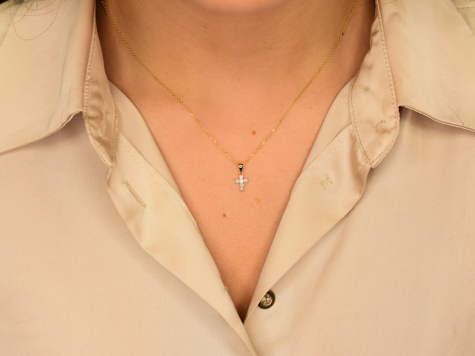 - Details: “Crafted from high-quality 14K gold, this stunning cross features dazzling 0.15 carat natural diamond accents that symbolize faith and hope.”