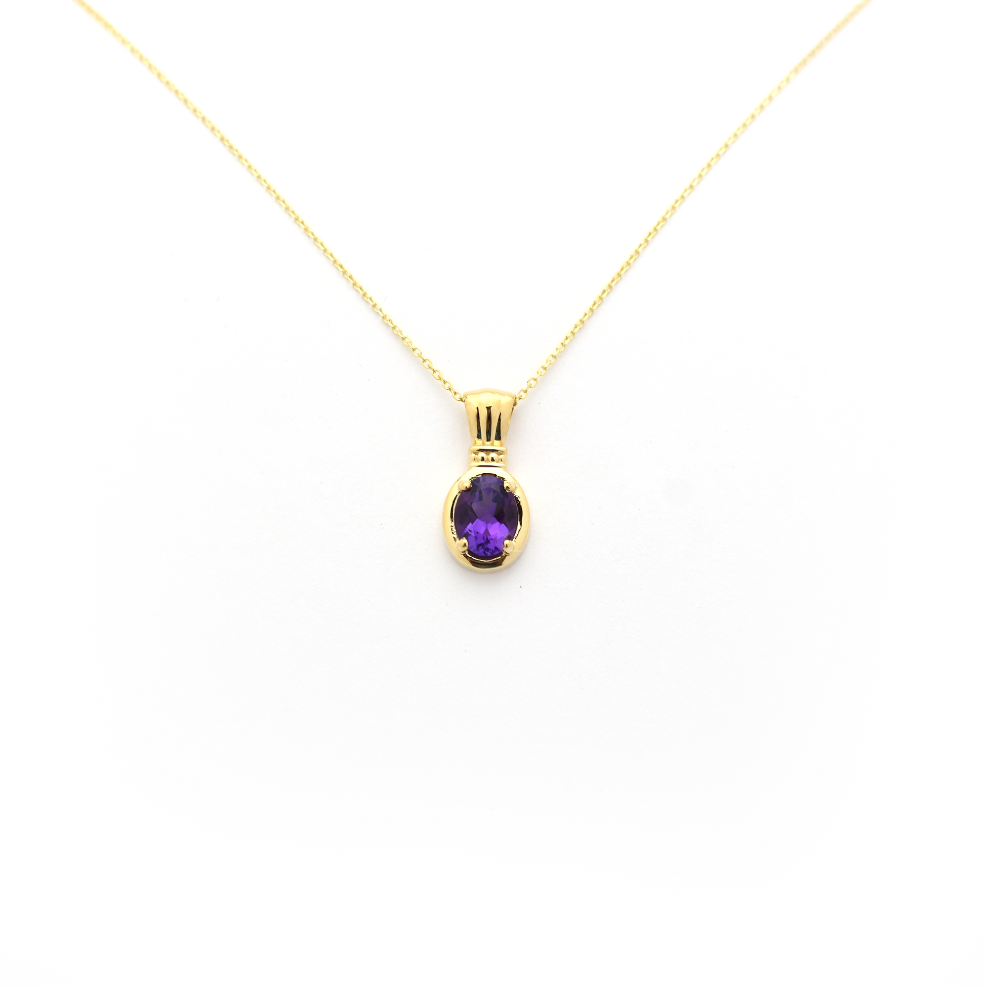 A Natural oval amethyst set in a solid 14 k gold hand made pendant . The vibrant purple color Amethyst is 1.25 carat total weight . the chain is optional and it is 14 k solid gold cable link chain with a lobster lock