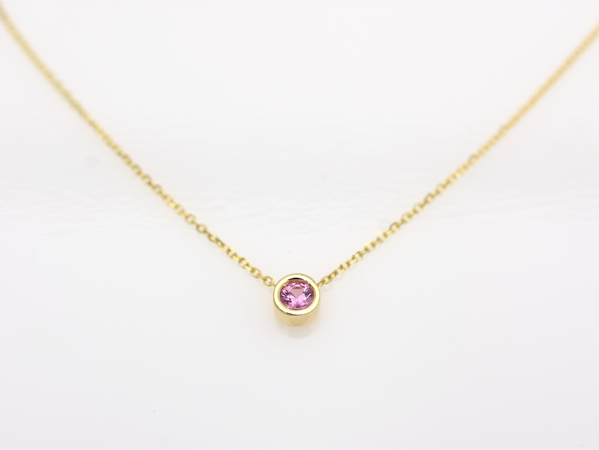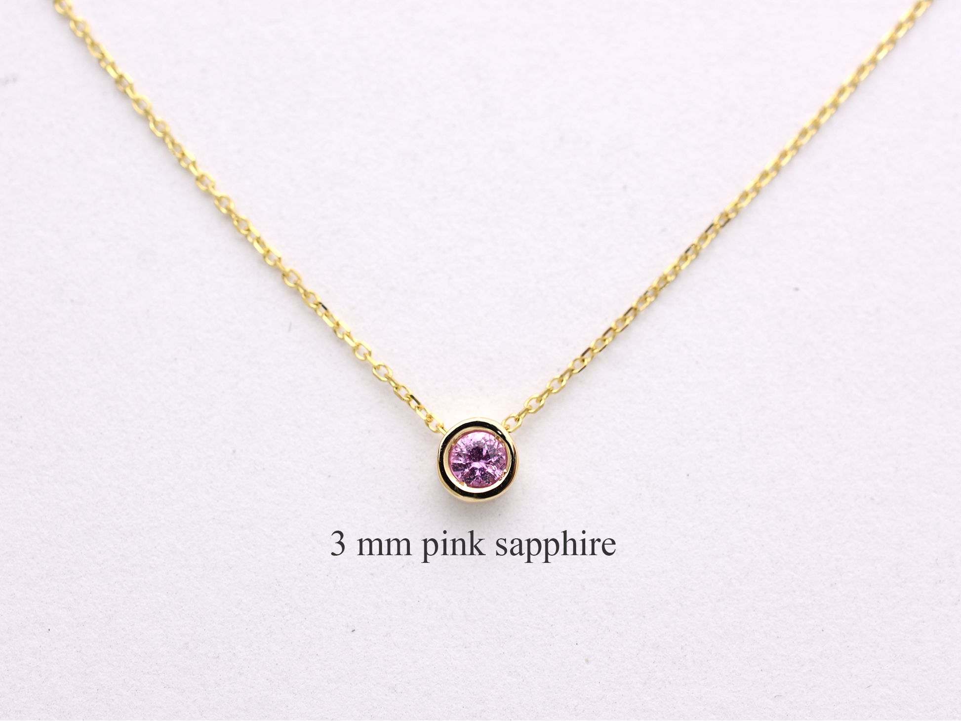Discover minimalist perfection with our exquisite sliding bezel necklace, featuring a vibrant, genuine pink sapphire. This dainty piece showcases a 3mm round pink sapphire, meticulously set in a polished 14k solid yellow gold bezel that protects the stone and enhances its color.