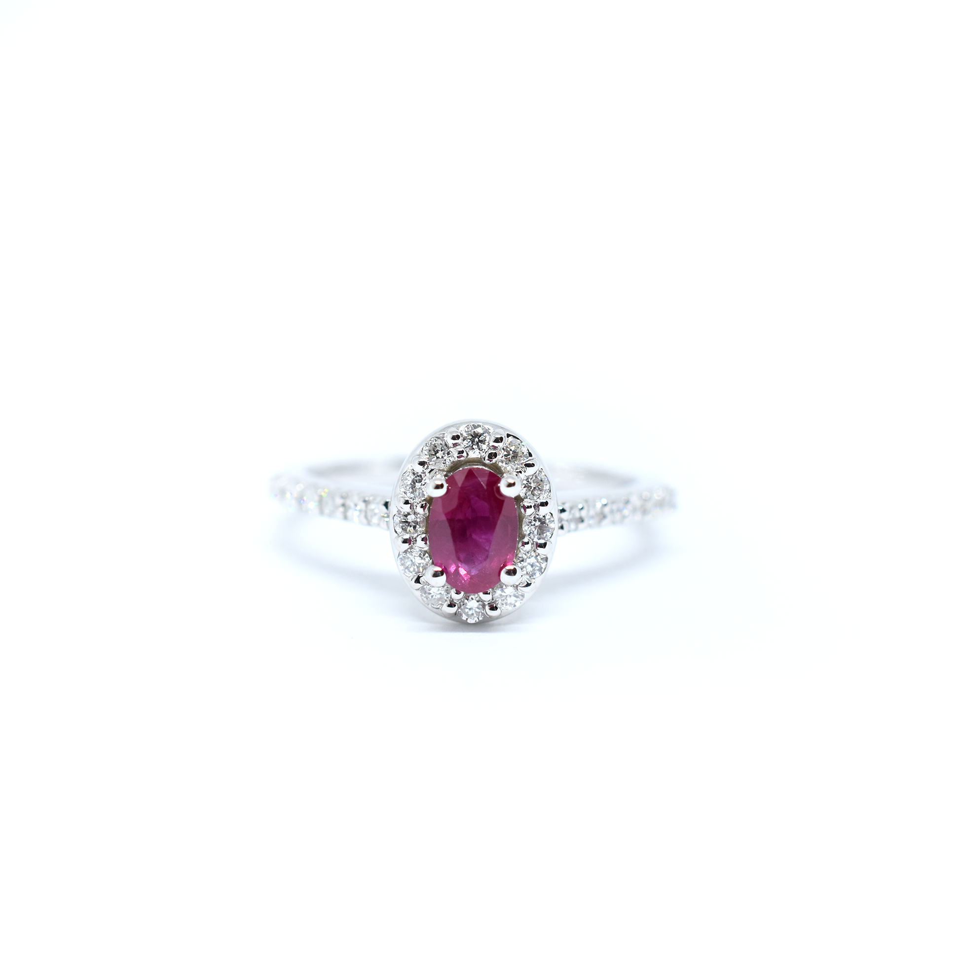 - This oval-shaped ruby is surrounded with a row of natural diamonds to enhance the alternative engagement ring comes in all three 14 k yellow gold, 14 k white gold,14 k rose gold.