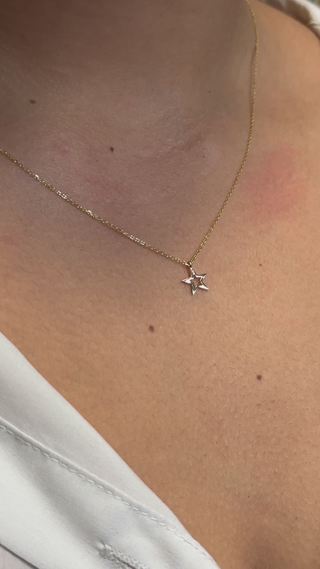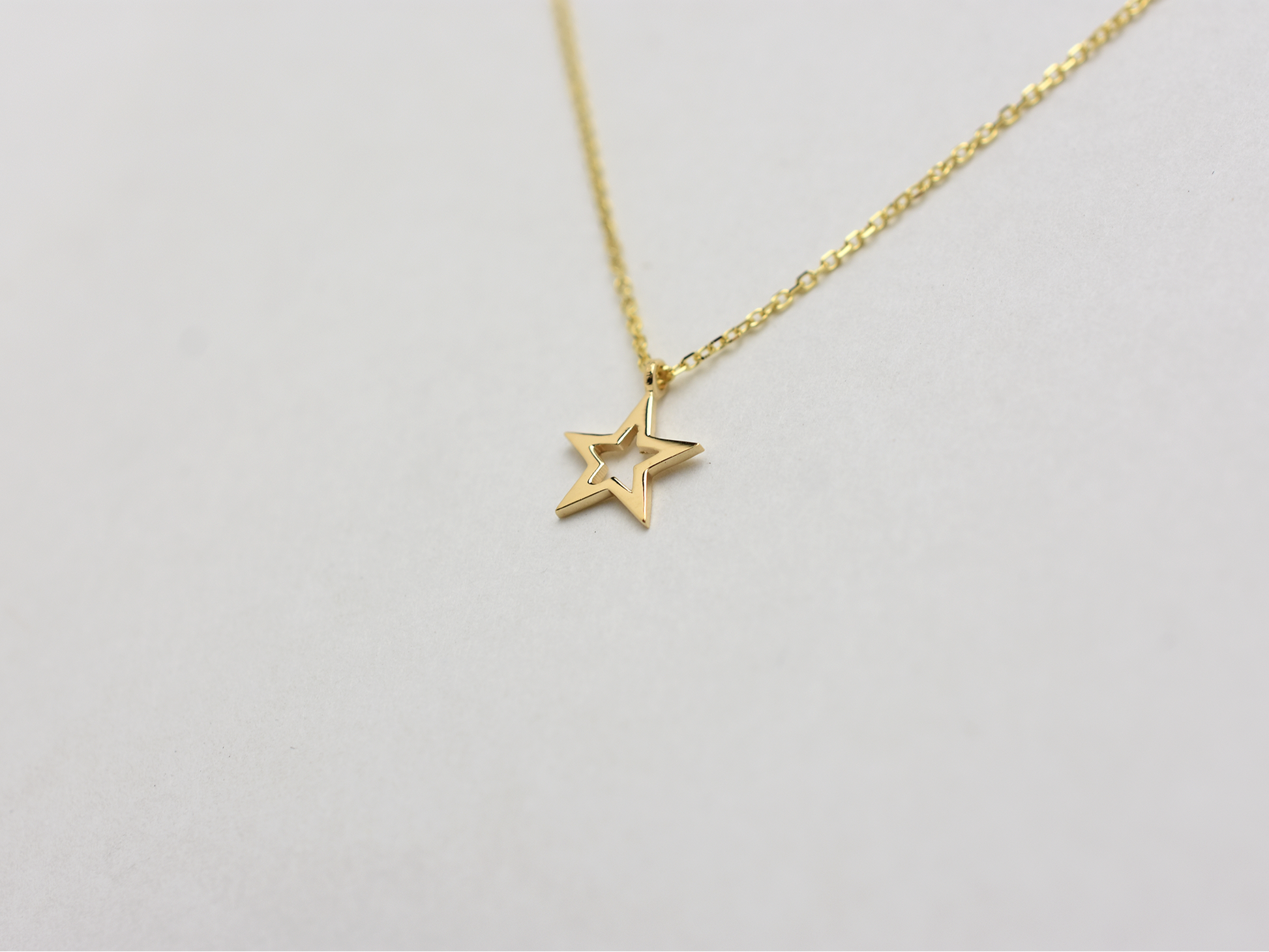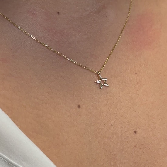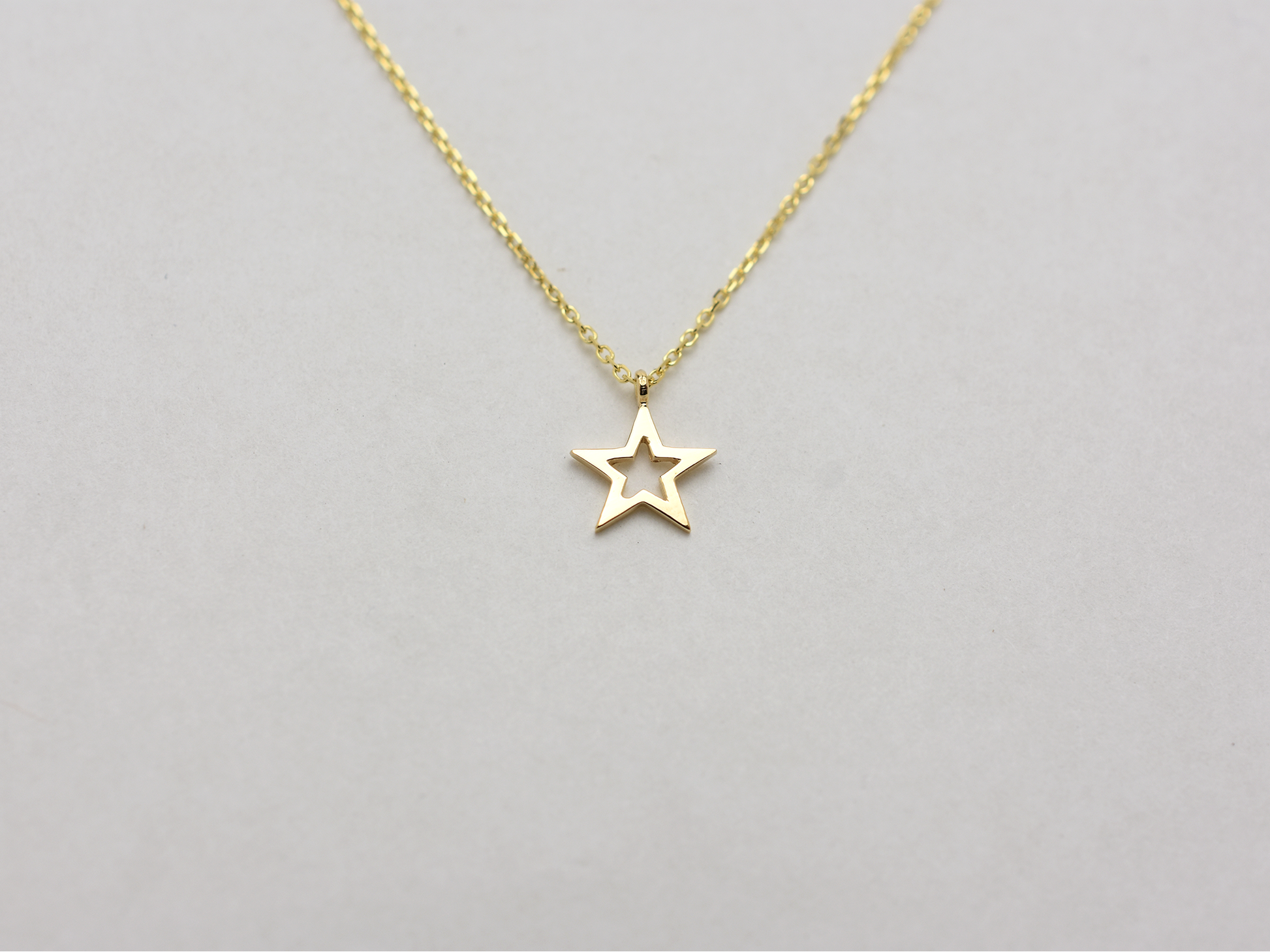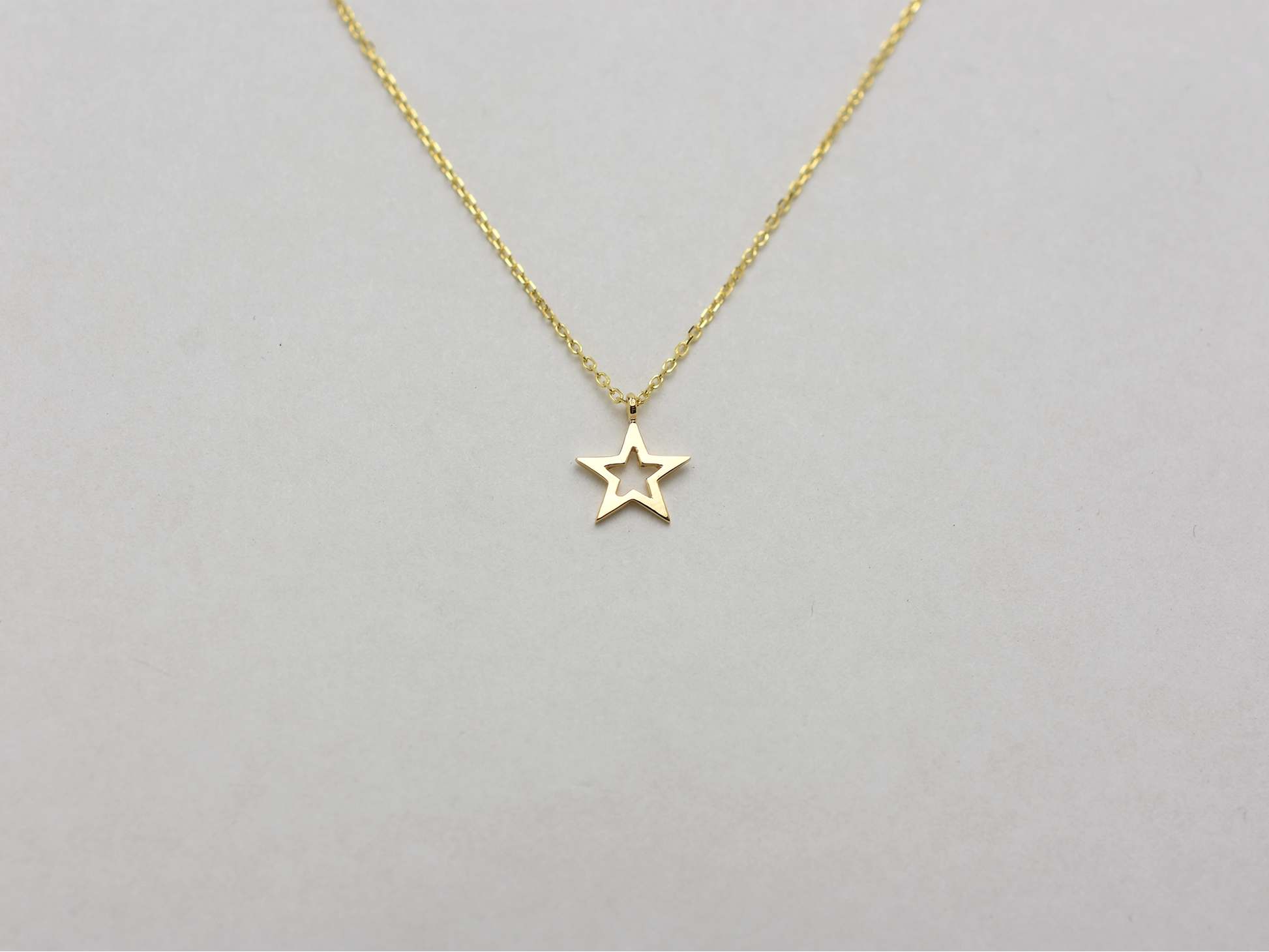 14 k solid gold star necklace . this minimalist layering necklace is available in 14 k yellow gold , whit gold , rose gold. The chain is 0.8 mm solid gold cable link chain with a lobster lock