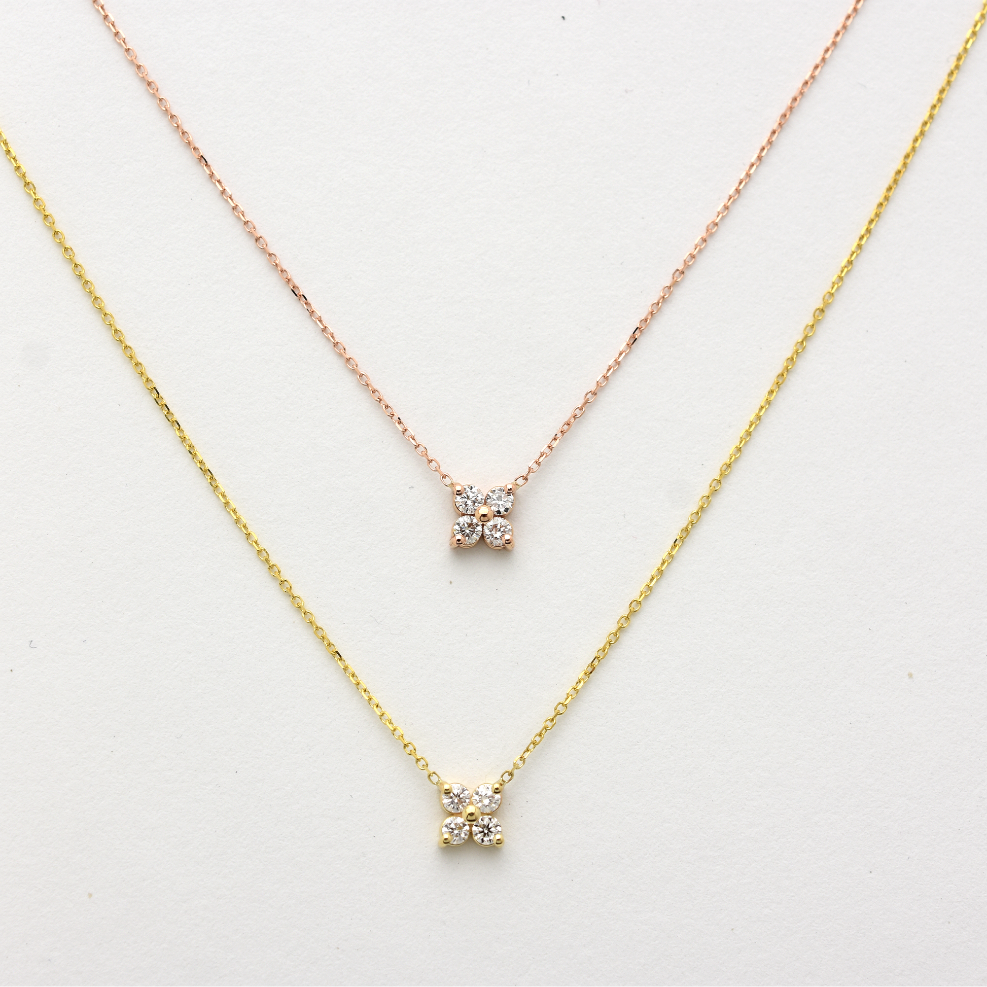 Elevate your everyday style with this exquisite, minimalist diamond cluster necklace. Featuring four brilliant-cut diamonds totaling 0.20 carats, this piece is designed to catch the light with every movement. The diamonds are expertly set in solid 14K gold, forming a beautiful, subtle floral or clover shape—a perfect symbol of luck and love.