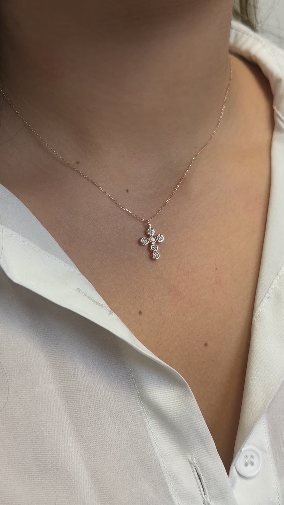 Handmade and handset dainty minimalist diamond bezel cross with 6 full cut round brilliant natural diamonds 0.30 ct tcw SI1 CLARITY G color. Each diamond is set in a bezel by me. the chain is a dainty solid 14k gold cable link chain. This cross is absolutely perfect for layering or for a minimalist look. I make this cross in 14k solid white , yellow and rose gold and in various lengths. please specify the color gold and length when ordering. **************** Free Shipping ********** within the USA
